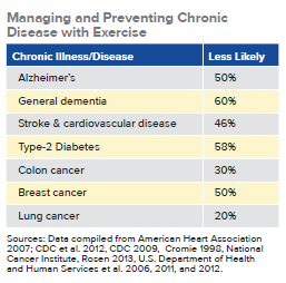 Research shows that regular exercise helps manage chronic disease like Type-2 diabetes, cancer, stroke, heart disease, osteoporosis, arthritis, and dementia. It reduces medical costs, fights depression, and prevents illness. Exercise impacts healing and recovery and can be used as a tool to extend treatment benefits and stop the revolving door to hospital readmission (CDC 2009).